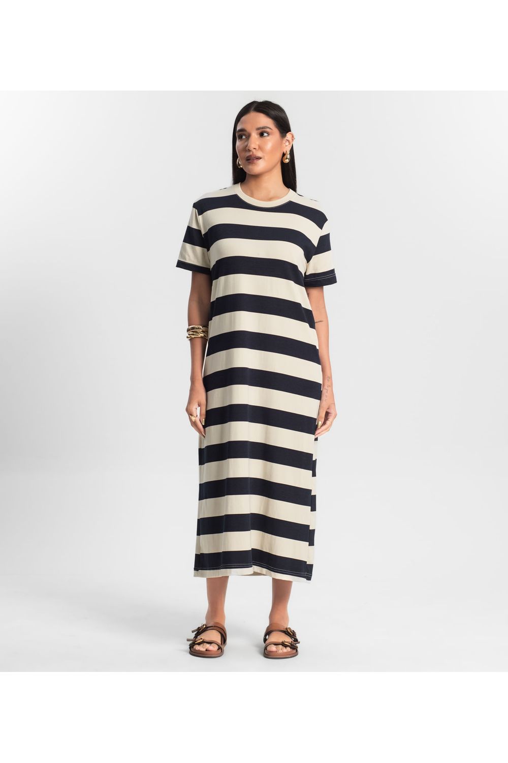 O Vestido Super Midi Rovitex é a escolha perfeita para quem busca conforto e elegância em um único look. Confeccionado em Cotton Leve listrado, ele garante frescor e suavidade, ideal para os dias mais quentes. O decote em friso traz um toque sutil de sofisticação, enquanto as mangas soltas até o cotovelo proporcionam liberdade de movimento e um visual descomplicado. Com modelagem reta, o vestido cria uma silhueta moderna e confortável, adequada para diferentes tipos de corpo.-