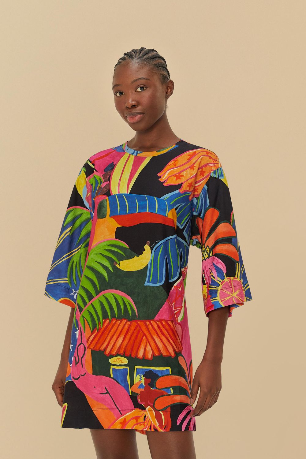 vestido t-shirt estampado fantasia da FARM é a combinação perfeita entre conforto e estilo casual. com modelagem reta e acabamento leve, este vestido possui mangas amplas que permitem liberdade de movimento. design autêntico que fala por si só. FARM RIO original - inverno 25.-