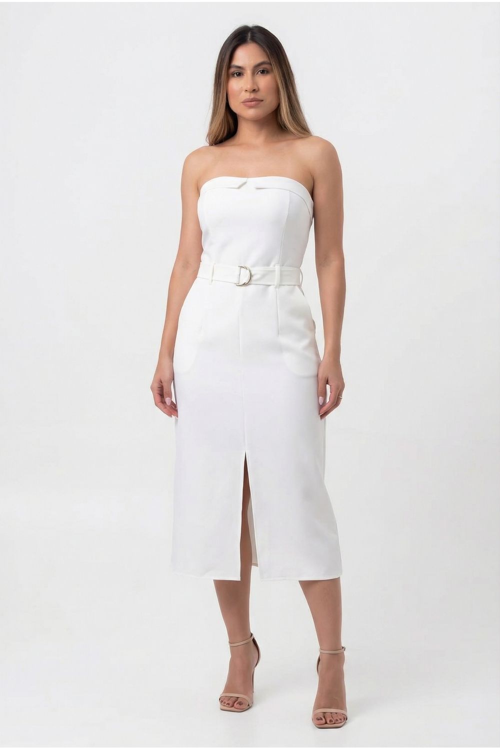 Vestido tomara que caia com cinto tecido alfaiataria