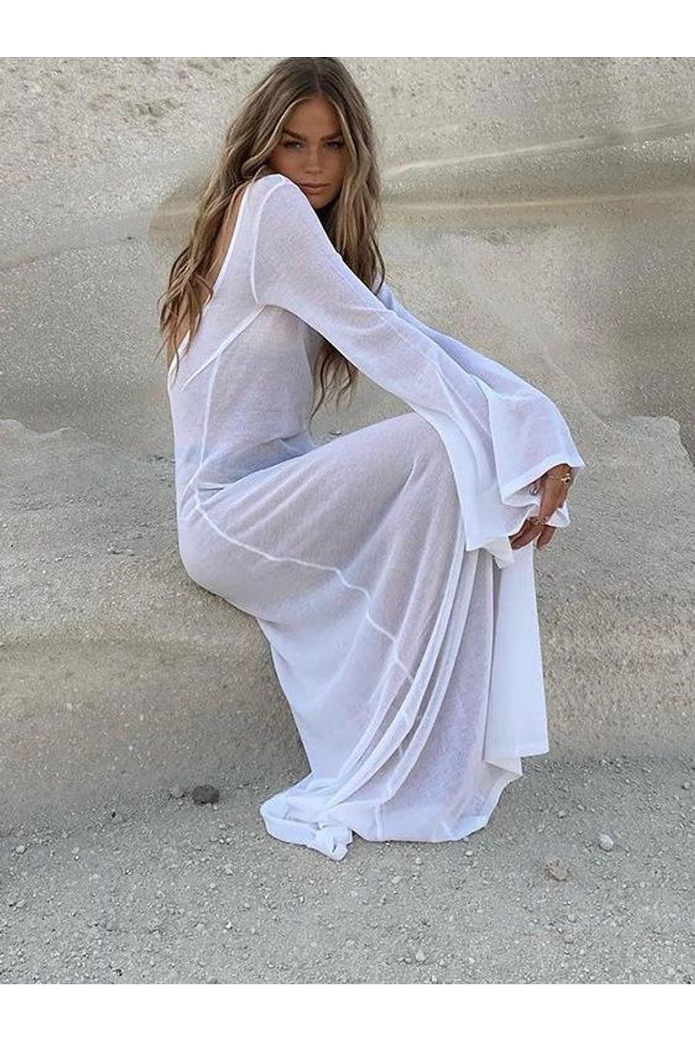 Vestido transparente decote costas manga sino branco