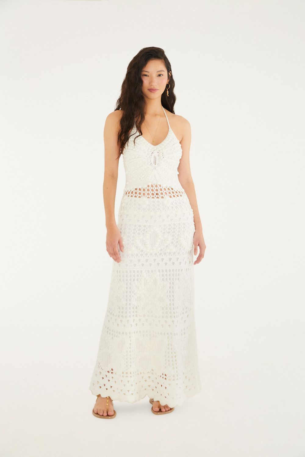 vestido tricot borboleta. possui decote profundo e alças finas, destacando elegância. a renda tricotada traz originalidade, enquanto o corte longo esbanja casualidade. ideal para dias quentes, eventos ao ar livre ou aquele passeio especial. a peça traduz leveza sem esforço. FARM RIO original - alto verão 26.-
