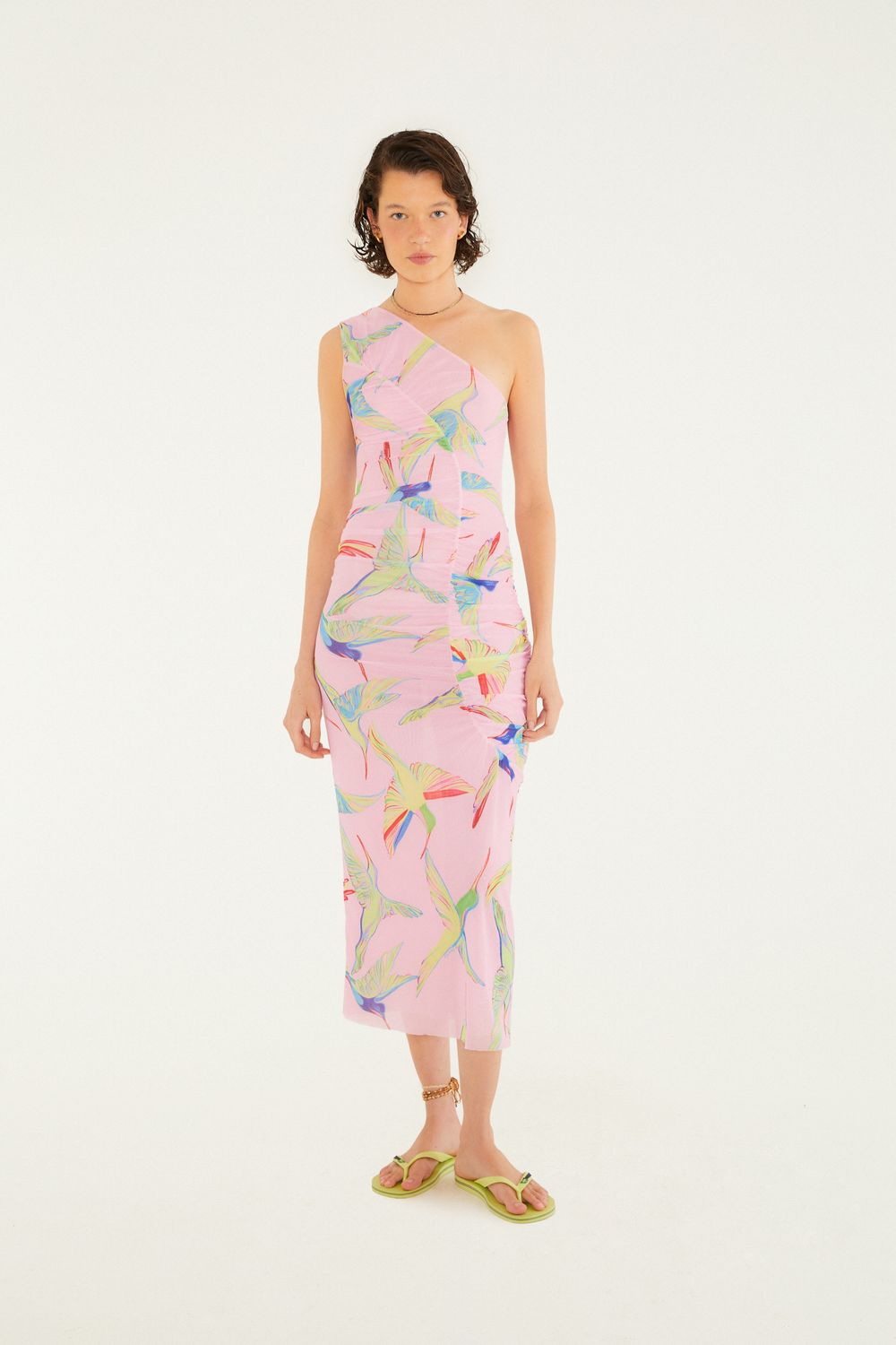Vestido Tule Franzido Estampado Beija Flor