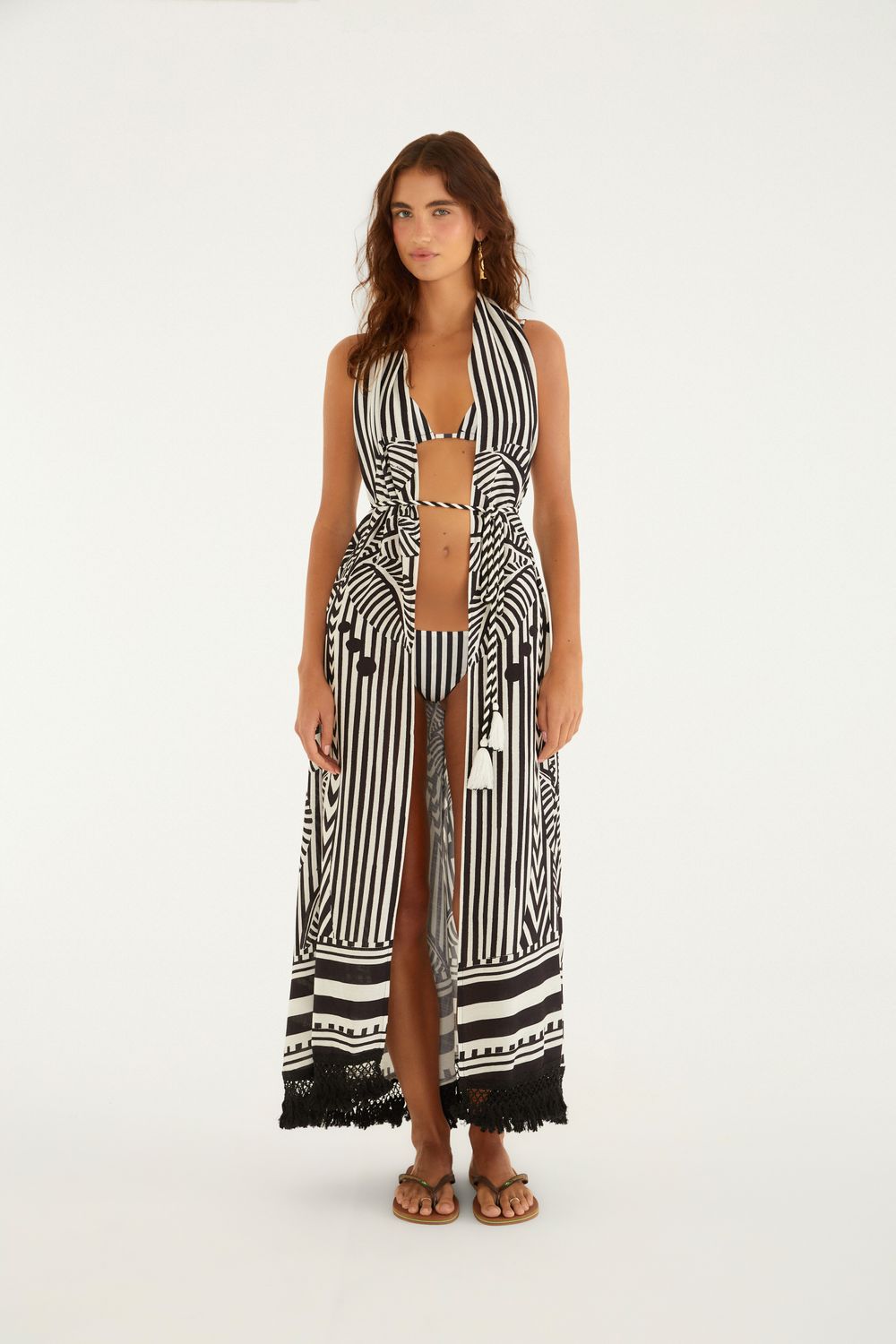 vestido tunica listra tropical. com um decote profundo e tiras multifuncionais nas costas, esta peça traz movimento e frescor. a modelagem fluida e as franjas na barra adicionam um toque casual e despojado, ideal para dias ensolarados ou uma saída à noite. FARM RIO original - inverno 26.-