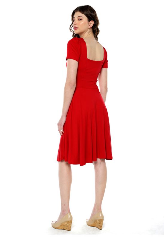 Vestido Vermelho Midi Decote Quadrado Manga Curta Rodado Sob